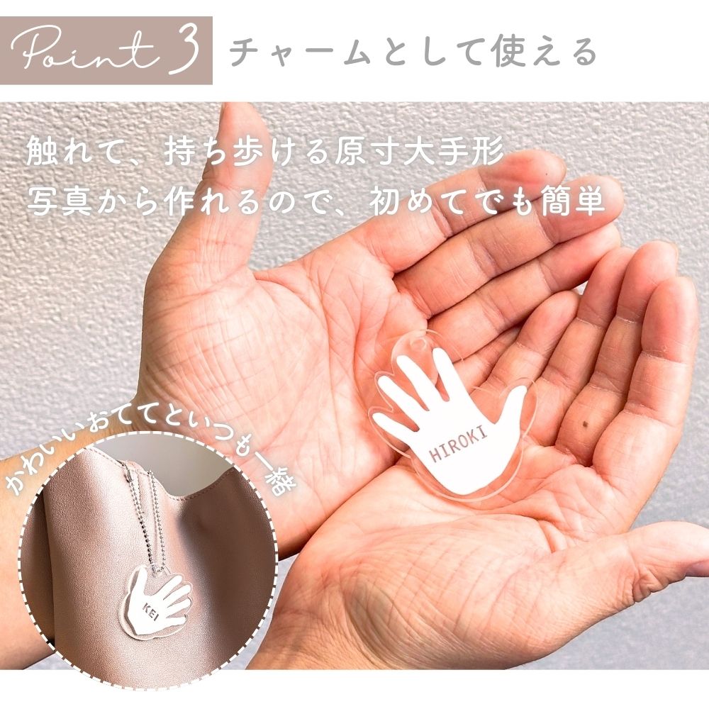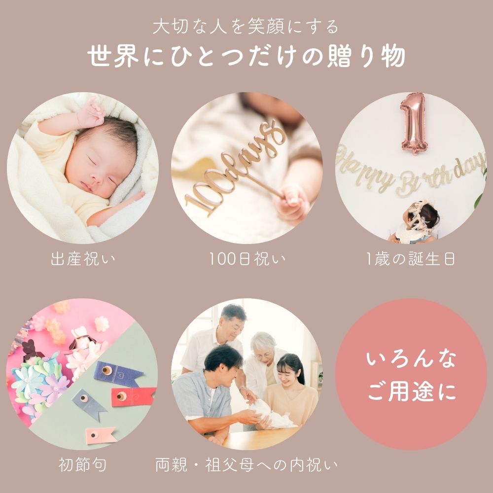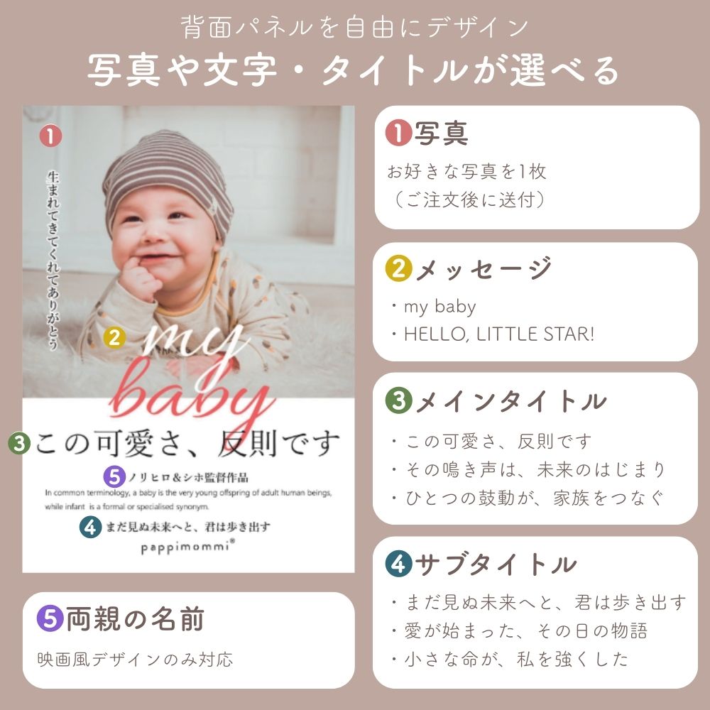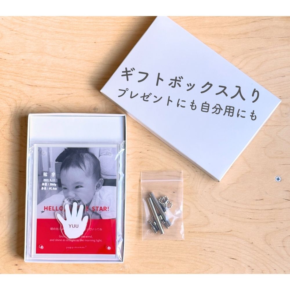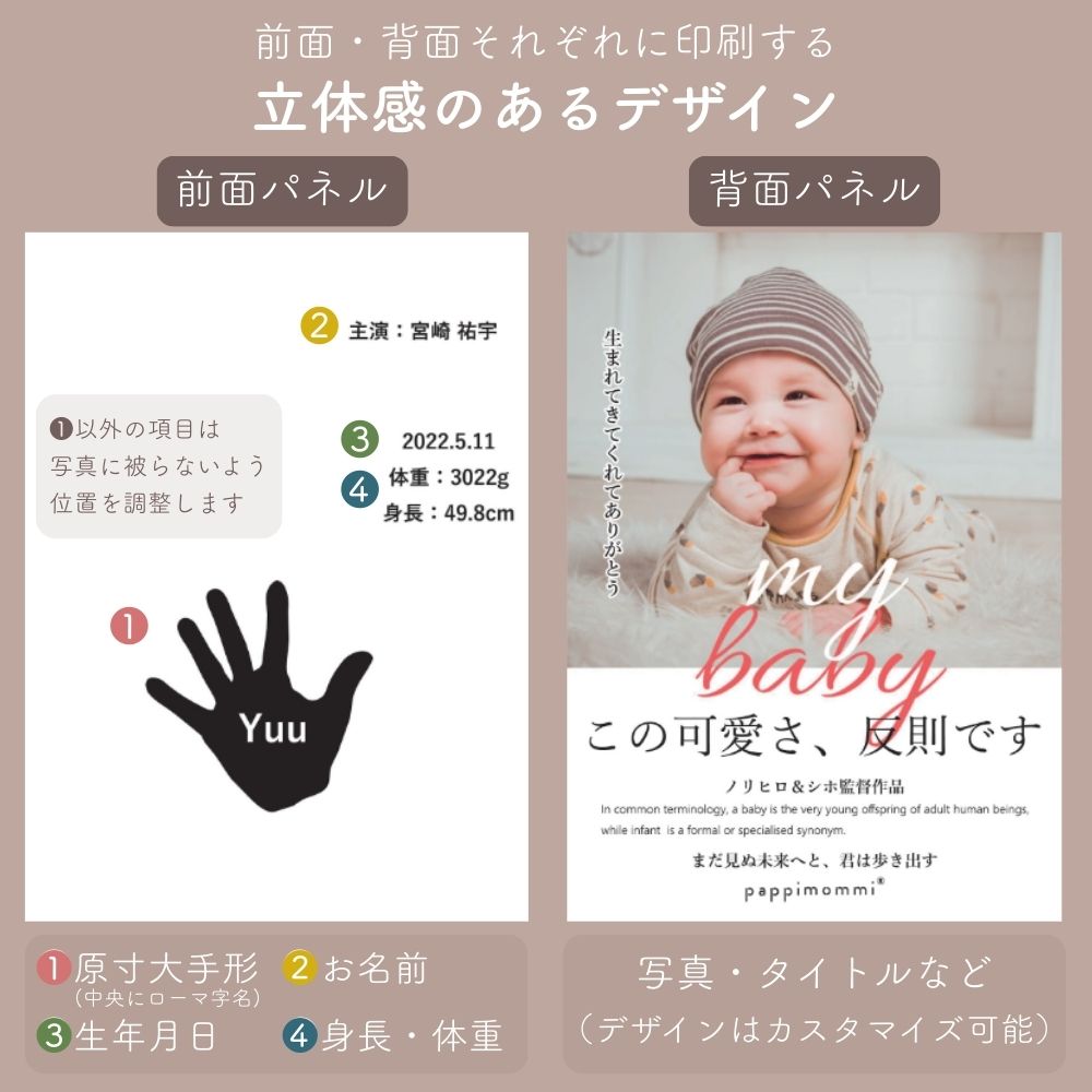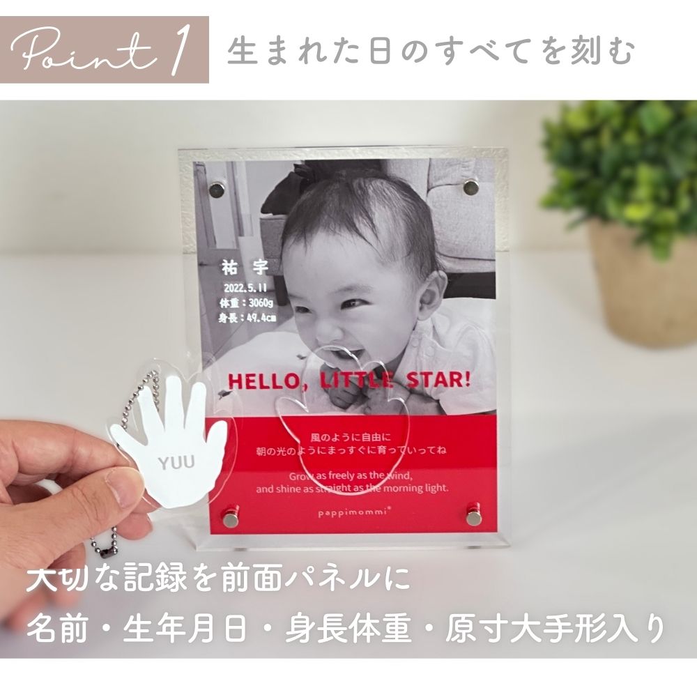 その小さな手のひらを、映画のワンシーンのように残す新感覚フォトスタンド。赤ちゃんの写真を映画ポスター風にデザインし、名前・生年月日・身長・体重を名入れ刻印できる2枚重ねアクリル仕様です。最大の特徴は、原寸大の手形をそのまま切り抜いてキーホルダーとして使えること。使わない時はパズルのように元に戻せ、飾る・持ち歩く・保管するが叶います。国内制作・高精細UV印刷のオーダーメイドで、出産祝い、内祝い、100日祝い、1歳誕生日、初節句などのベビー記念品に最適。写真入り・手形入りの世界にひとつだけの出産祝いギフトです。