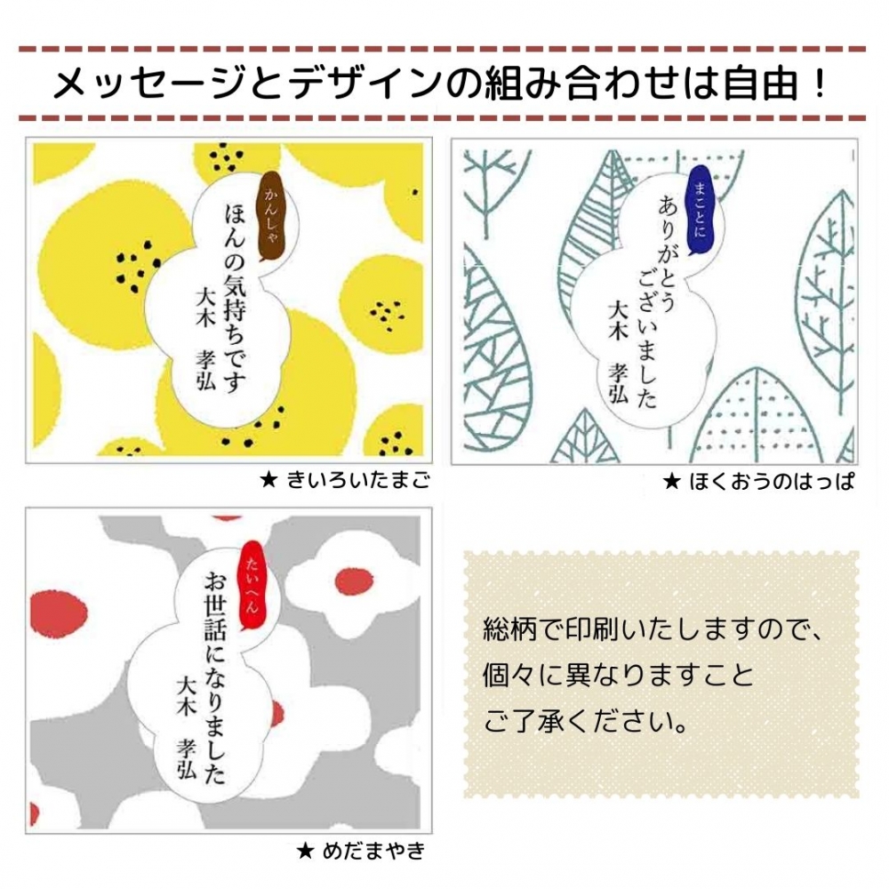 選べるデザインのしにメッセージ&お名前をつけて。会えなかった方のデスクの上にもおいておけます。メッセージは、(お世話になりました、ありがとうございます、ほんの気持ちです)など今までの感謝を伝える言葉。そして、新しいところには、「これから よろしくお願いします」と、ご挨拶の言葉とお名前が入れられます。